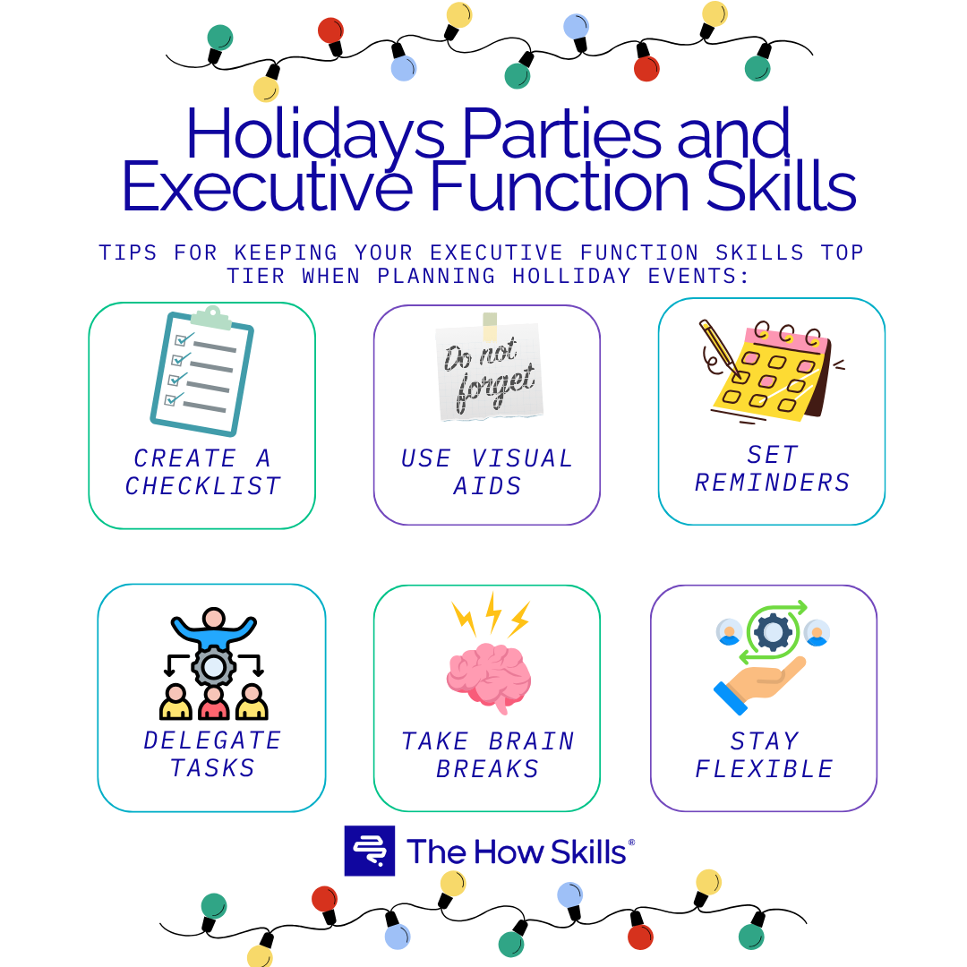 Did you know that many people struggle with executive function skills, especially when it comes to juggling multiple tasks, parties, and obligations during busy seasons like the holidays? Executive function skills encompass a range of cognitive abilities that help us plan, organize, and complete tasks effectively. For anyone hosting a holiday party, these skills are crucial to ensure that everything runs smoothly: no burnt turkeys, the perfect decor, and remembering to get everyone in your life a special gift. In this blog post, we will delve into what executive function skills are, how they impact your ability to host an event, and provide you with five essential tips to elevate your planning and execution, making your festive gathering a success.